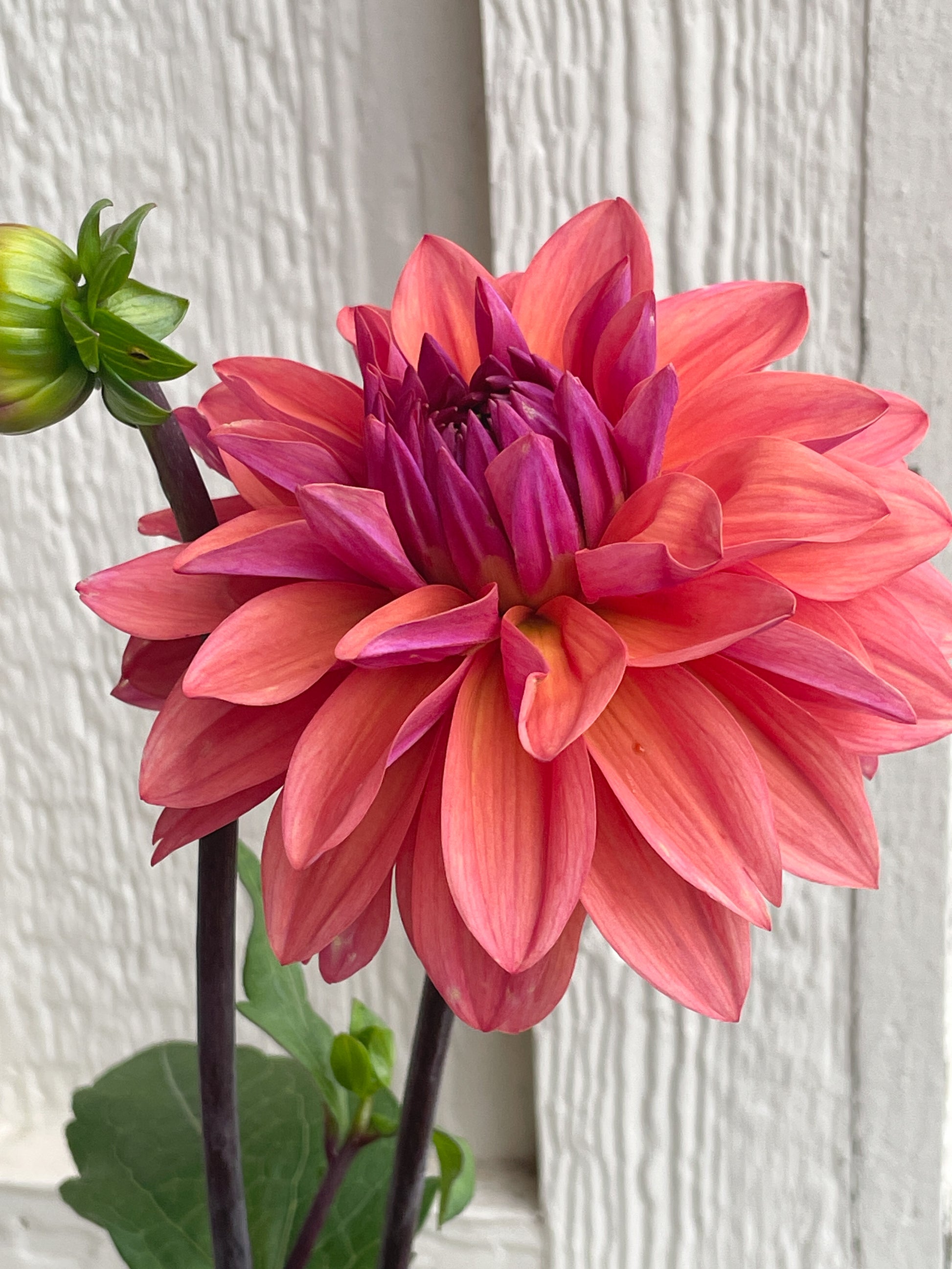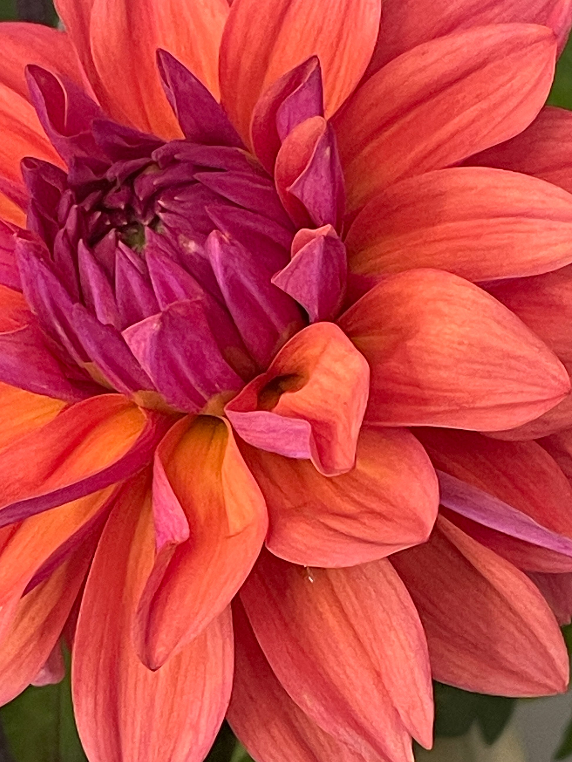 Add American Dawn to your garden if you're looking for a tropical sunrise. This exquisite dahlia is an absolute joy-spreader, with an astonishing gradient of warm, luminous color in every bloom. The outer petals open in a saturated blend of sunny peach, warm coral, and salmon, while the inner heart glows with a striking, rich violet-plum—a jewel-toned contrast that stops you in your tracks.